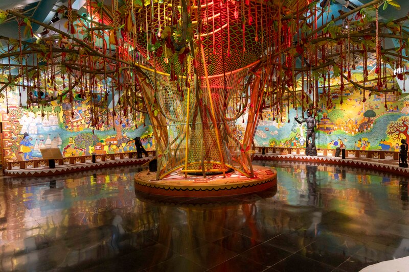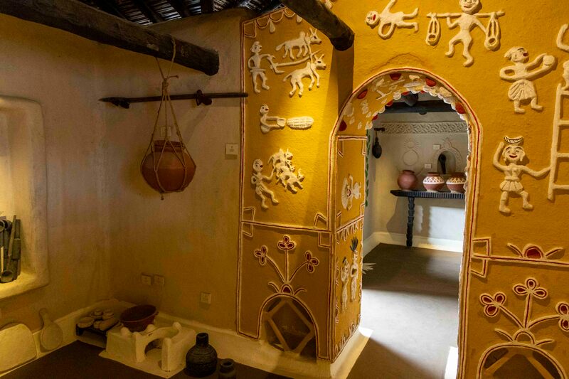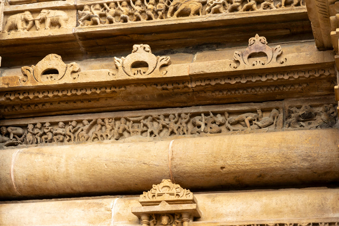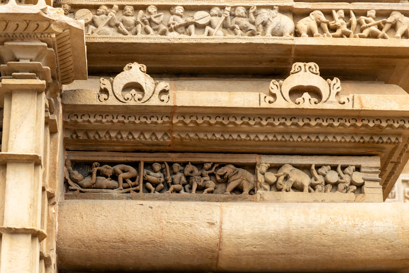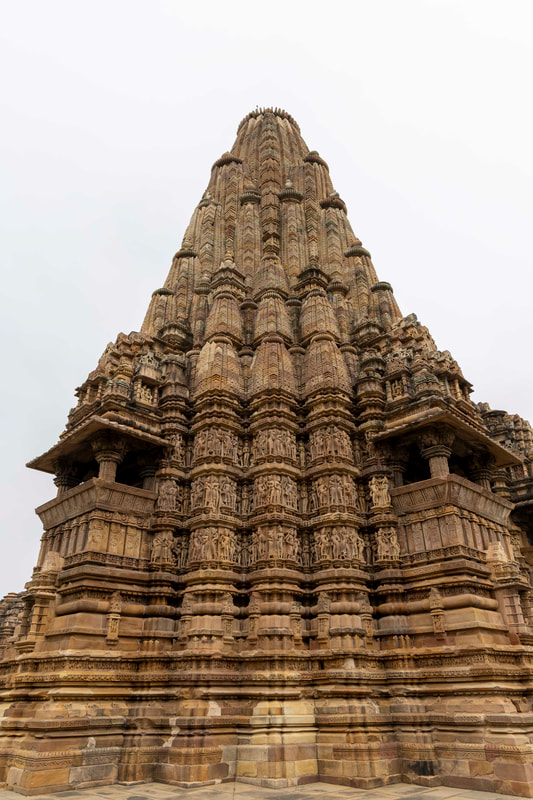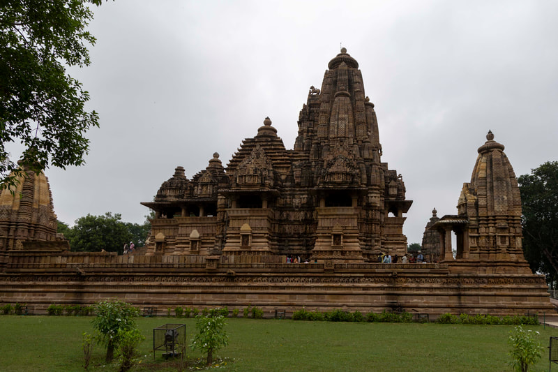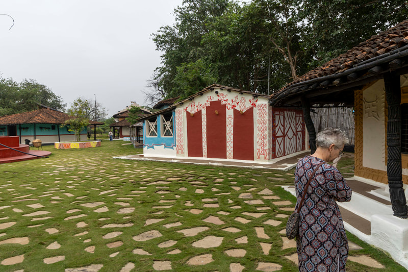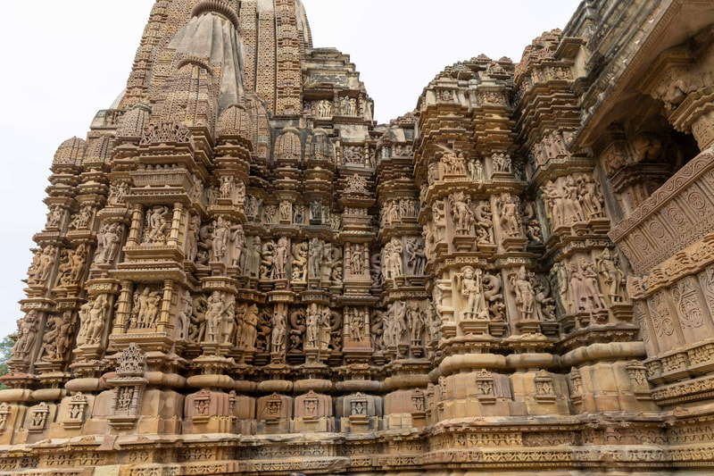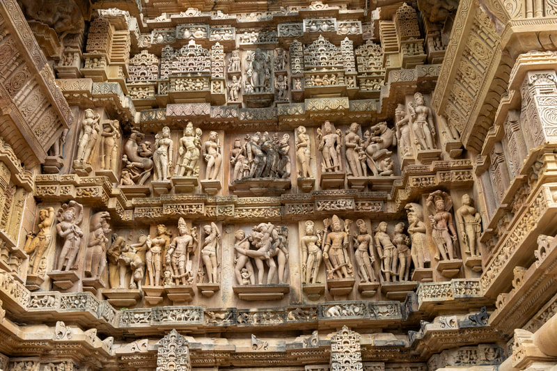 Ces figures sont toutefois bien plus que l'expression de la passion physique. Elles incarnent la philosophie des quatre objectifs de vie de l'hindouisme : le dharma (principe de l'action juste), l'artha (prospérité matérielle), le kāma (joie, sensualité et amour) et le moksha (union de l'âme avec le divin) et conduisent symboliquement le visiteur du sensuel vers le spirituel. Les temples de Khajuraho illustrent ce chemin spirituel de manière impressionnante. Le visiteur découvre d'abord l'extérieur – une vie pleine de mouvement, de musique, d'amour et de passion – puis pénètre peu à peu dans l'intérieur silencieux. Il est particulièrement impressionnant de voir avec quelle franchise et quelle désinvolture les artistes médiévaux abordaient des thèmes tels que l'amour, la sexualité et le désir. Même les représentations de scènes homosexuelles ou inhabituelles font ici partie d'une vision globale de la vie – une expression de la conception tantrique selon laquelle tout ce qui existe, y compris ce qui est tabou, fait partie de la création divine. Khajuraho nous rappelle que le sacré et le sensuel ne sont pas opposés. Tous deux sont l'expression de la même énergie créatrice qui imprègne l'univers. Après avoir visité cet impressionnant complexe de temples, nous avons déjeuné dans un restaurant suisse situé juste à l'extérieur, avec une vue magnifique sur les temples. Revigorés, nous avons ensuite visité le musée Aadivart Tribal & Folk Art. Il présente huit maisons typiques des tribus de la région ainsi que de l'art local traditionnel et moderne, notamment des œuvres des Gond, dont nous avons récemment acquis un tableau à Hyderabad. |
